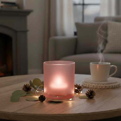 Buzlu Pembe Cam Mumluk dekorasyonda zarif bir detay arayanlar için ideal bir tercih. Buzlu yüzeyi ışığı yumuşakça yayar ve pembe tonu mekana romantik ve sıcak bir hava katar.